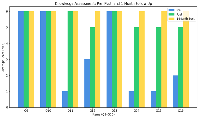 Six PMHNPs at RHCW completed both the pre- and post-intervention assessments, with all participants completing the one-month follow-up survey. Knowledge scores were calculated as the total number of correct responses across eight multiple-choice items (range 0-8). Pre-intervention scores ranged from 4 to 7 (M = 5.5, median = 5.5).