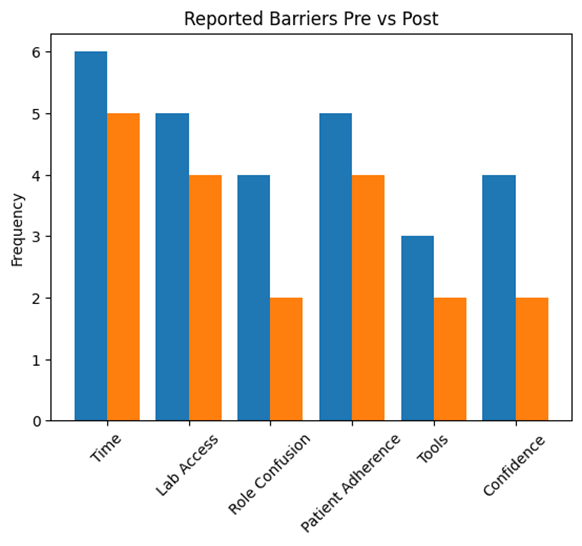 At baseline, commonly reported barriers included time constraints (n=2), patient nonadherence to laboratory testing (n=2), and lack of standardized tools (n=2). One participant also reported uncertainty regarding responsibility between psychiatric and primary care providers. Following the intervention, fewer participants identified lack of standardized tools as a barrier, suggesting that the implementation of the metabolic monitoring tool helped to address this gap. However, time constraints and patient adherence remained persistent challenges at both post-intervention and one-month follow-up.