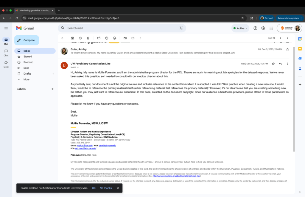 Population: The target population consists of PMHNPs and Family Nurse Practitioners (FNPs) at RHCW who prescribe SGAs as part of their clinical care. Participation was voluntary and providers were eligible if they routinely prescribe SGAs, and no exclusion criteria were applied. To maintain participant confidentiality, individuals were instructed to refrain from including identifying information, such as their names, on the assessment instruments.