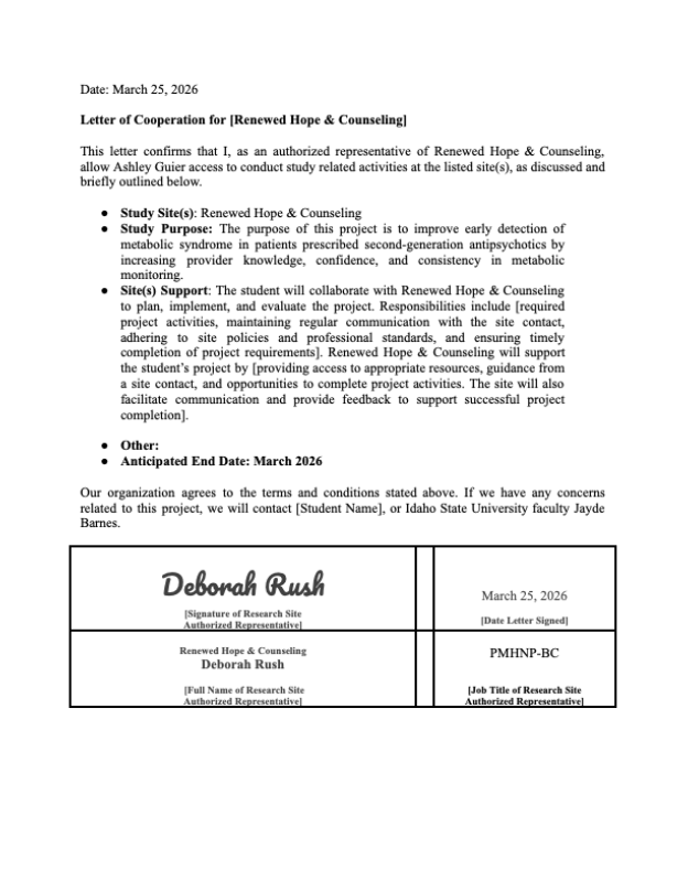 Setting: The project was conducted at Renewed Hope Counseling and Wellness (RHCW) in Meridian, Idaho, an outpatient community mental health clinic that provides psychiatric and counseling services for adults and children with a range of mental health conditions. Providers at this site routinely prescribe SGAs and are therefore well positioned to support early identification and referral for metabolic abnormalities.